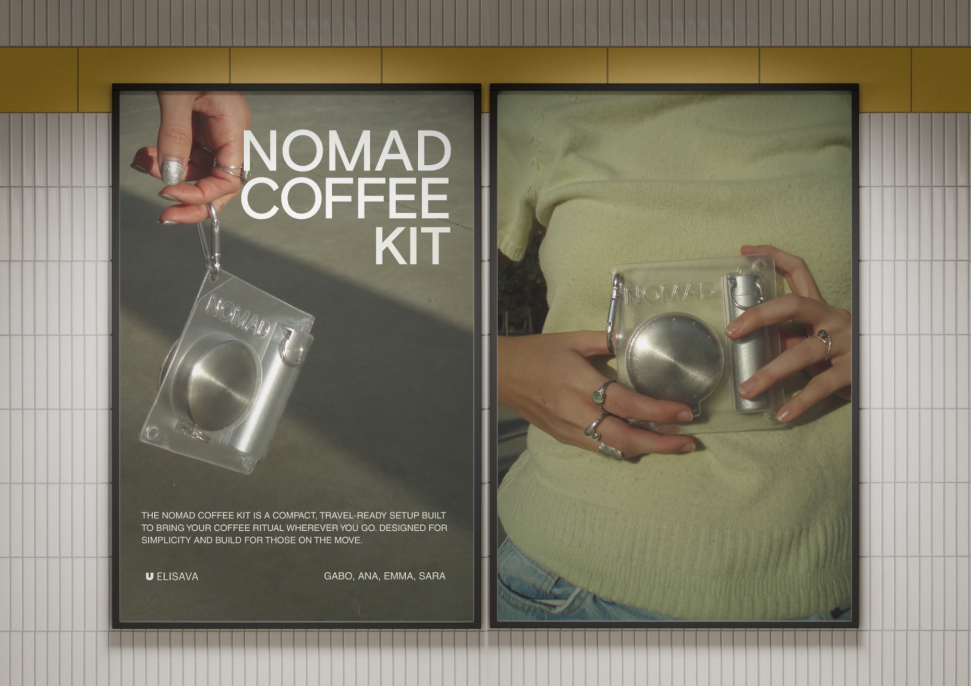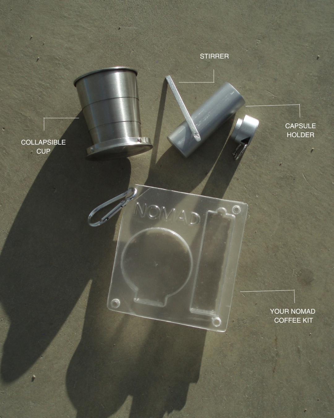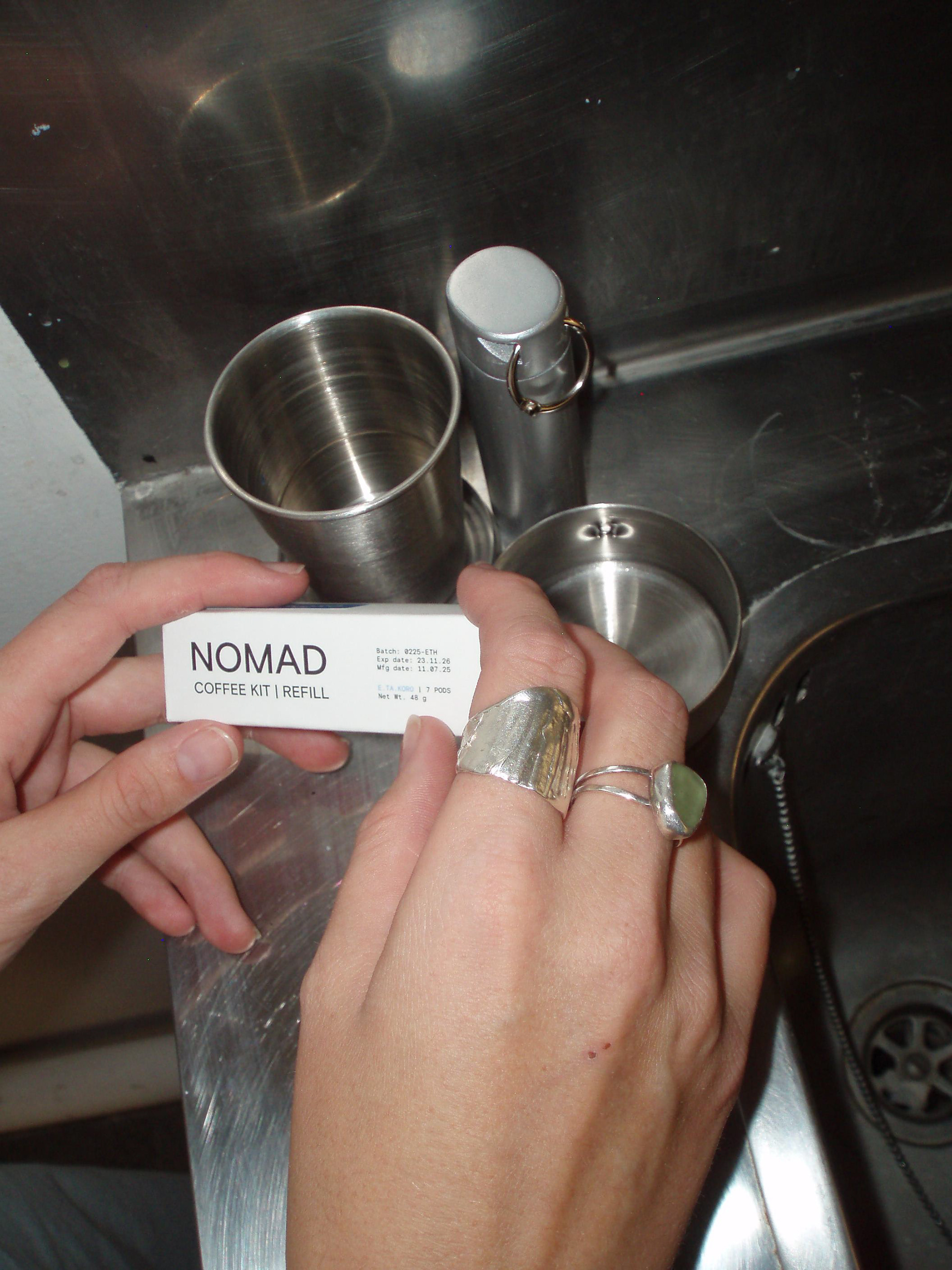 Dette var et gruppeprosjekt der vi fikk i oppgave å utvikle et kafferelatert produkt for en eksisterende kaffebar. Vi valgte Nomad Coffee og utviklet et portabelt kaffekit som består av en sammenleggbar kopp, en rørepinne og en kapselholder for kaffekapslene. Sammen videreutviklet vi konseptet og realiserte Nomad Coffee Kit som et fysisk produkt. I tillegg til selve produktet designet vi etikettene til kaffekitet og emballasjen til påfyllingskapslene. Vi utviklet også art direction og produserte alt visuelt innhold, inkludert fotografering.